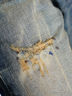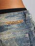 Детали: широкий втачной пояс и шлевки для ремня, застежка на молнии и на пуговице, пять карманов, джинсы вытерты, декорированы с эффектом запачканости и протертости, брючины прямые до щиколотки, стандартный крой.