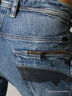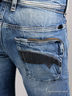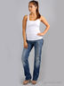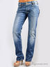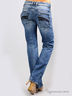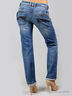 Детали: втачной пояс с шлевками под ремень, пять карманов, задние карманы декорированы металлической молнией, джинсы вытерты, штанина прямая до щиколотки, застежка на молнии и на пуговице.