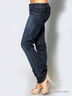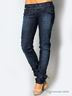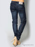 Детали: широкий втачной пояс и шлевки для ремня, застежка на молнии и на пуговице, пять карманов, джинсы слега вытерты, брючины заужены к низу, талия занижена.