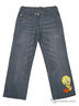 онкая джинсовая ткань с эффектом потертости; застежки: молния, пуговица; пояс регулируется внутренней резинкой; поясные петли; два втачных кармана спереди; два накладных кармана сзади; вышивка; аппликация