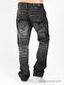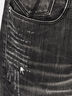 Детали: отрезной пояс со шлевками для ремня, застежка на пуговицу и молнию, два прорезных кармана спереди, два накладных с вышивкой сзади, модель с потертостями и печатным текстовым принтом.