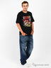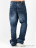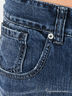 Детали: отрезной пояс со шлевками для ремня, застежка на пуговицу и молнию, два прорезных кармана спереди, два накладных с вышивкой сзади, модель с потертостями.