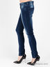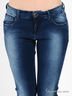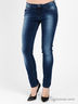 Джинсы с заниженной посадкой. Застежка на молнию и пуговицу. Шлевки для ремня. Зауженная модель с двумя втачными карманами спереди и двумя накладными карманами сзади. Модель декорирована элементами потертости.