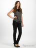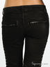 Прямые джинсы на низкой посадке, спереди фальш-карманы, коленки украшены горизонтальными строчками. Сзади карманы на молнии и по бокам кожаный переплет.