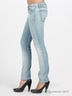 Джинсы классического прямого покроя. Отрезной пояс. Есть шлевки для ремня. Застегиваются на молнию и пуговицу. Пять карманов. Сзади треугольная кокетка.