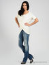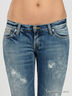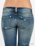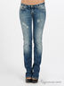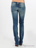 Джинсы прямого покроя с эффектом поношенности. Отрезной пояс. Есть шлевки для ремня. Застегиваются на пуговицу и молнию. Пять карманов. Сзади треугольная кокетка.