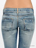 Джинсы классического прямого покроя. Отрезной пояс. Есть шлевки для ремня. Застегиваются на болты и молнию. Пять карманов. Сзади треугольная кокетка.
