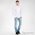 Модель прямого кроя застегивается на пуговицу и молнию. К поясу пришиты петли для ремня. Три передних кармана, два задних кармана. Контрастная прострочка, декоративная вышивка на задних карманах.