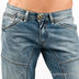 Стильная, оригинально скроенная модель застегивается на молнию и пуговицу. Эффект потертости. Отрезной пояс со шлевками для ремня.