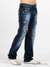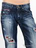 Джинсы прямого покроя темно-синего цвета с потертостями и затяжками. Декорированы хлопковыми вставками с трендовым принтом - клеткой. Отрезной пояс. Есть шлевки для ремня. Пять карманов. Застегиваются на молнию и пуговицу. Сзади треугольная кокетка.