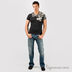 Стильная, оригинально скроенная модель застегивается на молнию и пуговицу. Эффект потертости. Отрезной пояс со шлевками для ремня.