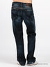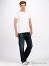 Джинсы прямого покроя темно-синего цвета с потертостями и затяжками. Отрезной пояс, есть шлевки для ремня. Застегиваются на молнию и пуговицу, пять карманов. Декорированы белой прострочкой.