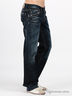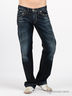 Джинсы прямого покроя темно-синего цвета с потертостями и затяжками. Отрезной пояс, есть шлевки для ремня. Застегиваются на молнию и пуговицу, пять карманов. Декорированы белой прострочкой.