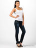 Стильные женские джинсы прямого кроя. Застежка на молнию и пуговицу. К поясу пришиты шлевки для ремня. Изделие украшено цепочками и стразами.