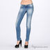 Зауженная модель застегивается на пуговицу и молнию. К поясу пришиты петли для ремня. Три передних кармана, два задних кармана. Декоративные металлические элементы на правом заднем кармане.