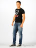 Джинсы мужские оригинального кроя. Отрезной пояс со шлевками для ремня. Застежка на молнию и пуговицу. Три кармана спереди - два втачных и один накладной с клапаном, застегивается на пуговицу. Два глубоких накладных кармана сзади. Изделие декорировано яркой прострочкой оранжевого цвета, а так же вкраплениями краски в тон прострочке.