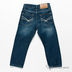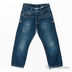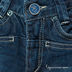 Модель прямого кроя застегивается на пуговицу и молнию. Пришиты шлевки. Три передних кармана, два задних кармана. Эффект потертости. Контрастная прострочка, декоративная вышивка на задних карманах.