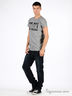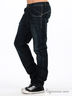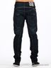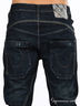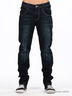 Мужские джинсы оригинального покроя темно-синего цвета с эффектом потертости. Отрезнйо пояс, есть шлевки для ремня. Четыре кармана. Застегиваются на молнию и пуговицу. Декорированы контрастной прострочкой.