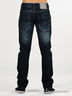 Мужские джинсы прямого покроя темно-синего цвета с эффектом потертости. Отрезнйо пояс, есть шлевки для ремня. Пять больших карманов. Застегиваются на молнию и пуговицу. Декорированы контрастной прострочкой.