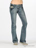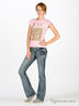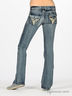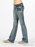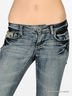 Джинсы-клеш. Классический крой с пятью карманами. Широкий отрезной пояс со шлевками для ремня. Застегиваются на молнию и две пуговицы. Карманы декорированы ажурной аппликацией.
