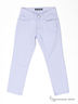 Детали: отрезной пояс со шлевками для ремня, застежка на пуговицу и молнию, два прорезных кармана спереди, два накладных сзади, зауженные брючины.
