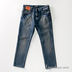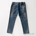 Брюки для мальчика синего цвета. Выполнены из плотной хлопковой ткани джинс. Классическая 5-карманная модель, прямого кроя. Окрас с искусственными потертостями и складками. Застегиваются на молнию, пояс на пуговицу. Карманы закреплены металлическими клепками.