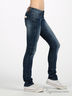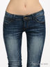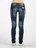 Узкие пятикарманные джинсы с потертостями и зацепками. Застегиваются на молнию и пуговицу. Украшены контрастной прострочкой.