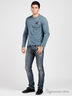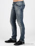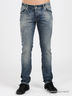 Детали: втачной пояс и шлевки для ремня, застежка на пуговицах, пять карманов, джинсы вытерты с небольшими протертостями, брючины заужены к низу.