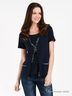 Модная футболка с эффектом двойки выполнена из трикотажа средней плотности. Округлый вырез горловины, короткий рукав с обработкой швом-закруткой. Два передних кармашка. Имитация кардигана декорирована рюшей. Отличный вариант для тех, кто любит комфорт и качество.