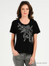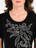 Детали: укороченный прямой рукав, полочка декорирована набивным рисунком и стразами