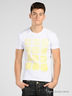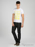 Трикотажная мужская футболка прямого покроя с округлым вырезом горловины и короткими рукавами. Модель декорирована контрастным набивным рисунком и аппликацией.