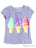 Модная футболка в полоску с короткими рукавами и округлым вырезом горловины. Изделие декорировано оригинальной крупной аппликацией с блёсками в виде мороженного. Состав 100% хлопок, что обеспечивает комфорт и удобство при носке.