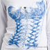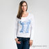 Тонкий мягкий трикотаж. Приталенный крой. Длинный рукав. Округлый вырез горловины. На полочке аппликация из гипюровой ткани с мелкими стразами.