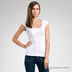 Тонкий легкий трикотаж, приталенный крой. Короткий рукав. Глубокий округлый вырез горловины. На полочке декоративные защипы с прострочкой. У выреза горловины пришиты цветы из тонкого креп-шифона со стразами.