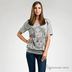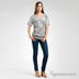 Тонкий трикотаж, свободный крой. Короткий приспущенный рукав. Округлый вырез горловины. Декоративные прорези с черной лентой у левого плеча. Низ изделия посажен на широкую манжету. На полочке принт с мелкими стразами.
