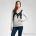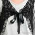 Тонкий мягкий трикотаж. Длинный рукав. Округлый вырез горловины. Низ изделия посажен на широкую манжету. На полочке принт и декоративная нашивка из гипюровой ткани с лентой.