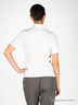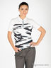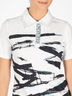 Футболка-поло из трикотажной ткани. Отложной воротник. Ворот декорирован пайетками, застегивается на пуговицы. Короткий рукав. Спереди набивной рисунок, стразы.