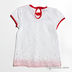 Футболка для девочки свободного кроя. Круглый вырез горловины окантован с фигурным перекручиванием, с застежкой на спинке. Короткие рукава присборены на плечах. Украшена текстильной брошью.