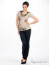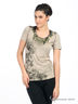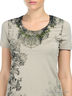 Детали: округлый вырез горловины декорирован пришитыми стразами и набивным рисунком