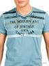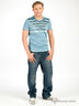 Классическая модель футболки. V-образный вырез. Винтажный набивной рисунок на передней полочке. Контрастные швы. Необработанные края на рукавах и по низу футболки.