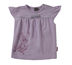 Футболка лиловая с небольшим бантиком на груди и графическим рисунком в правой нижней части. На двух кнопках на левом плече.