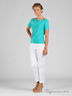 Футболка из плотного трикотажа. Прямой силуэт. Короткий рукав с отворотом. Широкий вырез-лодочка, декорирован стразами, бисером и пайетками.