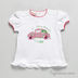 Трикотажная футболка расклешенного покроя. Круглая горловина. Короткие рукава-фонарики. На полочке принт с нашивками и стазами.