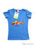 Приталенная модель с коротким рукавом украшена аппликацией.