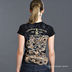Женская футболка выполнена из 100% хлопка. Модель имеет круглый вырез, отделанный мягким трикотажем. Футболка украшена тату-принтами, декорированными цветными стразами.