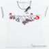 Футболка для девочки из хлопковой ткани. На полочке оригинальная аппликация со стразами. Застегивается на пуговицу сзади. Окантовка выреза и края рукава контрастного цвета.