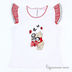 Футболка для девочки из хлопковой ткани. На полочке оригинальная аппликация со стразами. Короткий рукав в виде оборок с принтом. Застегивается на пуговицу сзади.