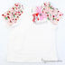 Футболка для девочки. Застегивается сзади на пуговицу. На полочке декоративные бантики и надпись из страз. Рукава в виде многослойных оборок с принтом.