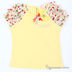 Футболка для девочки. Застегивается сзади на пуговицу. На полочке декоративные бантики и надпись из страз. Рукава в виде многослойных оборок с принтом.