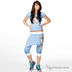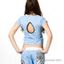 Футболка голубая с коротким рукавом, с вырезом в виде капли на спине, и принтом спереди